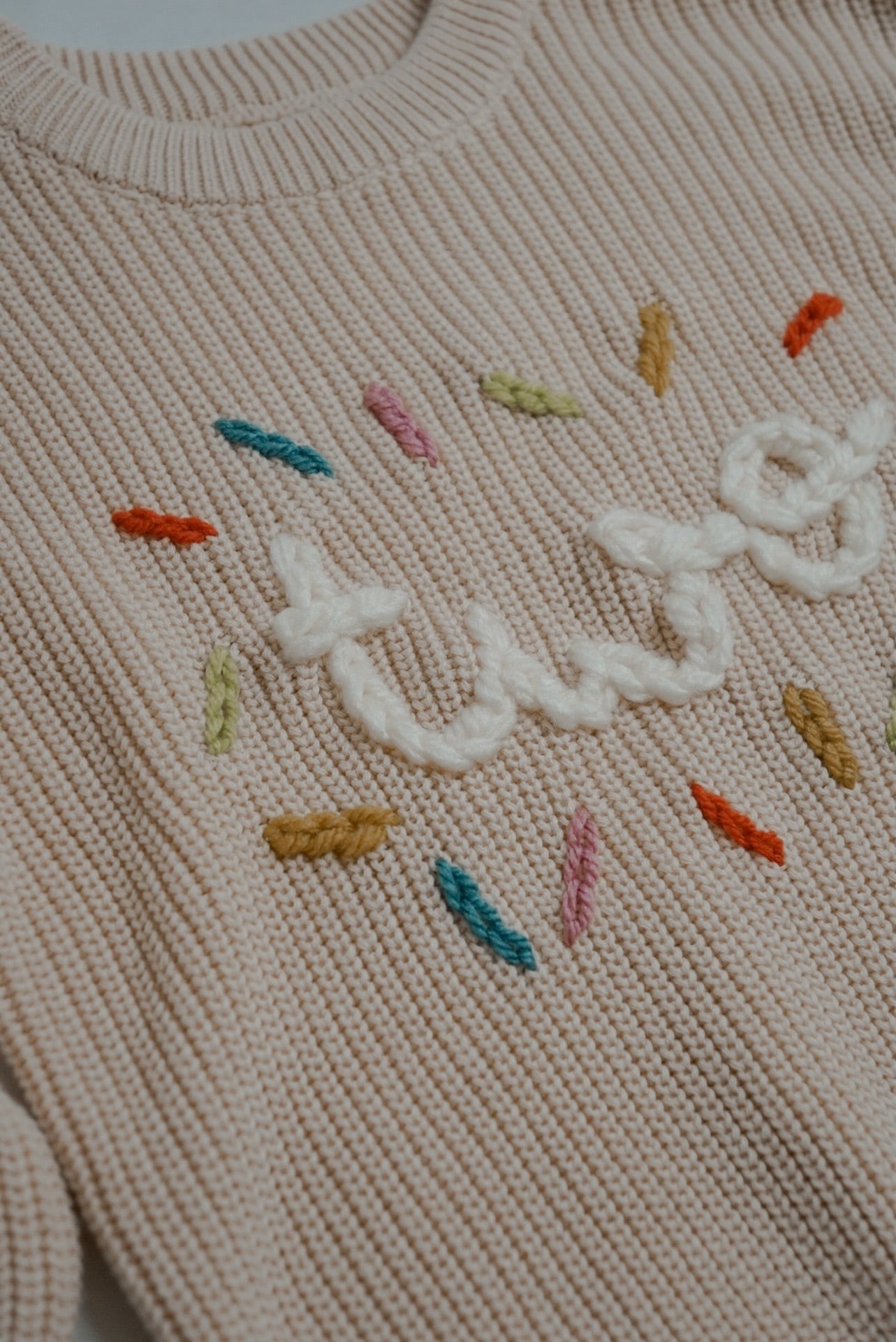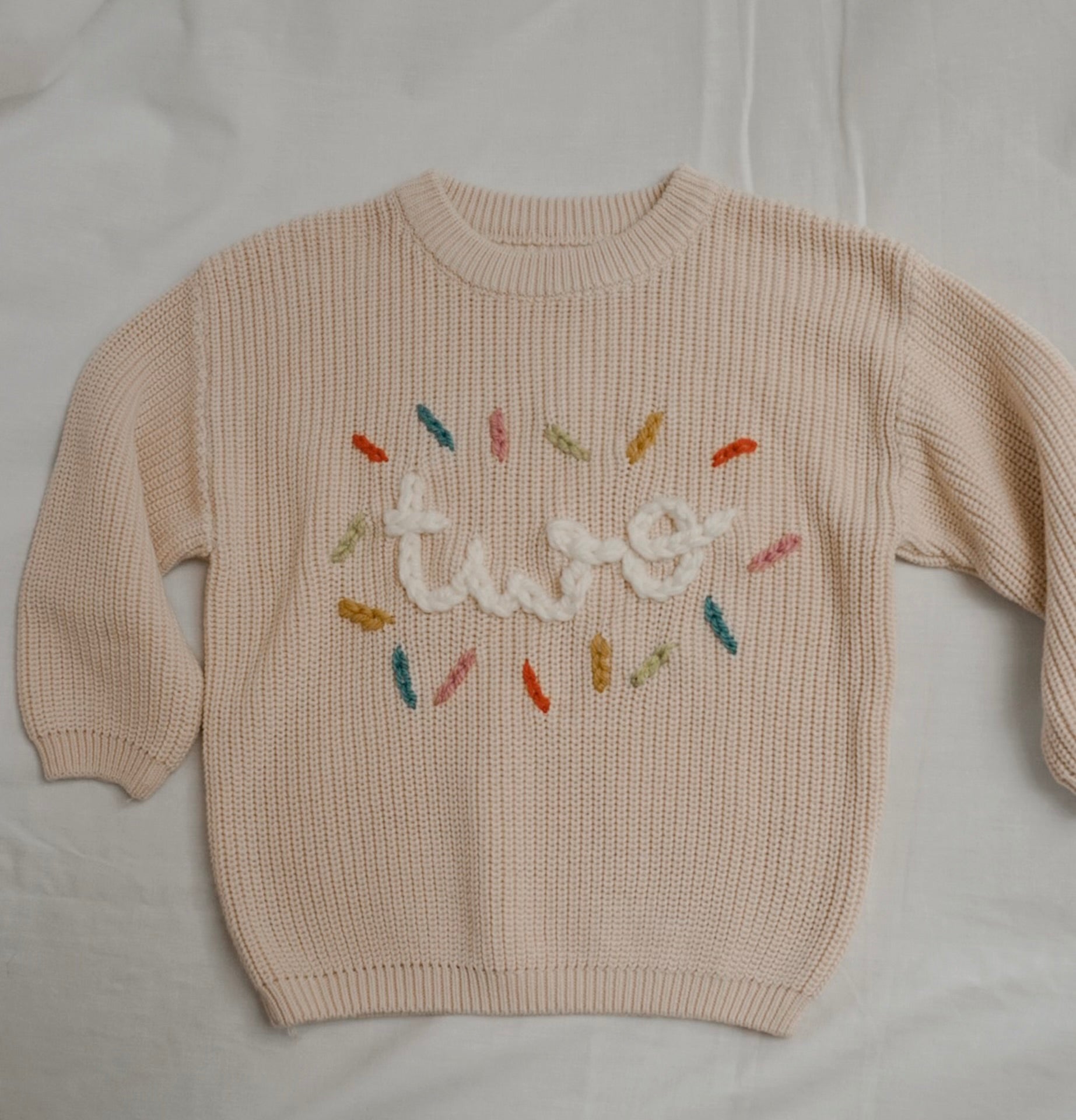 Gorgeous 100% cotton ‘two’ celebration knit for your little one.